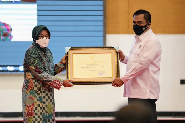 Menteri Sosial Tri Rismaharini memberikan piagam penghargaan kepada 143 aparat penegak hukum di Gedung Aneka Bhakti Jakarta hari ini. Penghargaan ini diberikan sebagai apresiasi dalam penyelamatan uang negara terkait bantuan sosial (bansos).