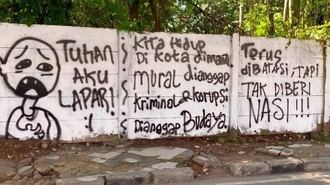 "Jadi memang konten (mural) isinya kayak 'Tuhan Saya Lapar', terus ada 'Kita Hidup di Negeri Korupsi Jadi Budaya'. Cuman nggak ada gambar-gambar kayak mirip Pak Presiden atau gambar siapa pun. Cuman tulisannya itu tidak mencerminkan sama sekali estetika, hanya gambar-gambar boneka yang nggak enak dipandang," kata Taufiqurrahman saat dihubungi detikcom, Jumat (27/8/2021).