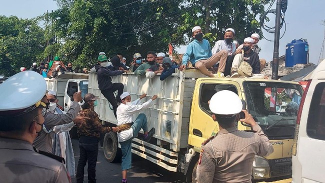 Massa pendukung Habib Rizieq Shihab yang hendak menggelar demo di Pengadilan Tinggi DKI Jakarta dihalau polisi. Beberapa di antaranya dicegat saat menaiki truk barang.
