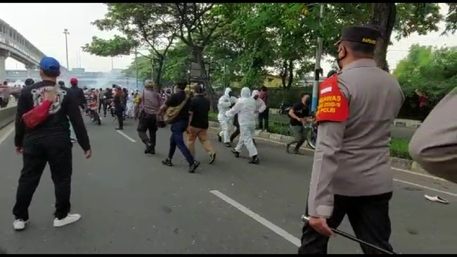 Massa tiba-tiba datang dari arah Pulogadung, Jakarta Timur. Polisi kemudian mencoba menghalau massa dengan mengedepankan pasukan ber-hazmat.