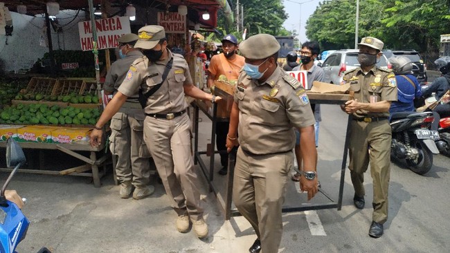 Petugas gabungan menyisir lokasi hingga 500 m dari pintu keluar pasar, kemudian berputar balik dan menyambangi pedagang buah yang menjejerkan lapaknya di sepanjang jalan.
