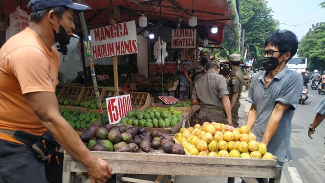 Satpol PP tidak menyita buah-buahan yang jadi dagangannya. Ismail dibantu oleh rekannya sesama penjual untuk mengangkat meja dan meletakannya sedemikian rupa agar tidak berada di atas trotoar.