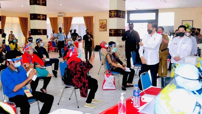 Jokowi mengawali kunjungannya di Politeknik Kesehatan (Poltekkes) Tanjung Karang, Kecamatan Natar, Kabupaten Lampung Selatan, Kamis (2/9/2021). Kegiatan vaksinasi ini dilaksanakan kepada 100 pelaku usaha mikro, kecil, dan menengah (UMKM).