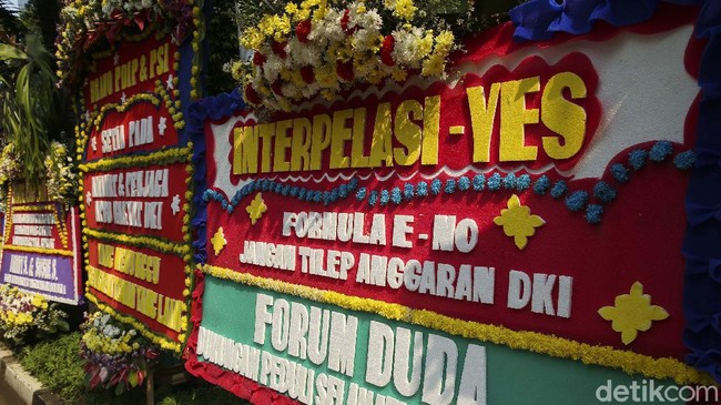 Sebelumnya diberitakan, kantor DPRD DKI Jakarta kebanjiran kiriman karangan bunga. Sebagian besar bertuliskan dukungan interpelasi terhadap Gubernur DKI Jakarta Anies Baswedan soal Formula E.