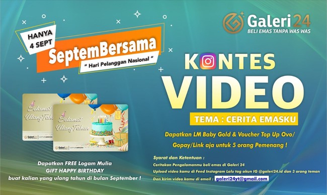 Promo Ulang tahun ini diluncurkan oleh Galeri 24 ditujukan untuk pelanggan yang berulang tahun di bulan September. Setiap pelanggan yang melakukan minimal transaksi Rp 1,5 juta di Galeri 24 di tanggal 4 September dan berulang tahun di bulan September bisa mendapatkan free emas batangan seri Gift dengan design 'Happy Birthday' atau 'Congratulation'.