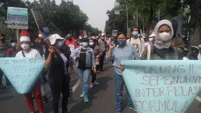 Selama demonstrasi, massa membawa sejumlah atribut, seperti poster ataupun spanduk bertuliskan penolakan Formula E. Mereka juga mendukung interpelasi ke Gubernur DKI Anies Baswedan.