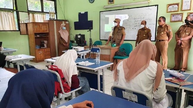 Rahmat Effendi seketika mengecek salah satu kelas yang sedang melaksanakan pembelajaran tatap muka. Ia memeriksa kelengkapan protokol kesehatan di kelas.