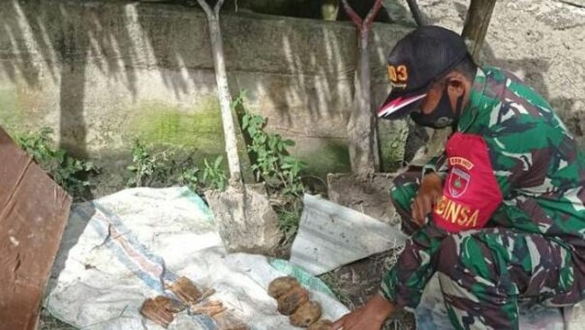 "Waktu menggali sekira kedalaman 1 meter, saya melihat barang bulat mirip Granat dan juga runcing-runcing mirip Peluru, melihat barang itu saya langsung menghubungi Ibu Desa dan Bhabinsa," kata Luther, Senin (6/9/2021).