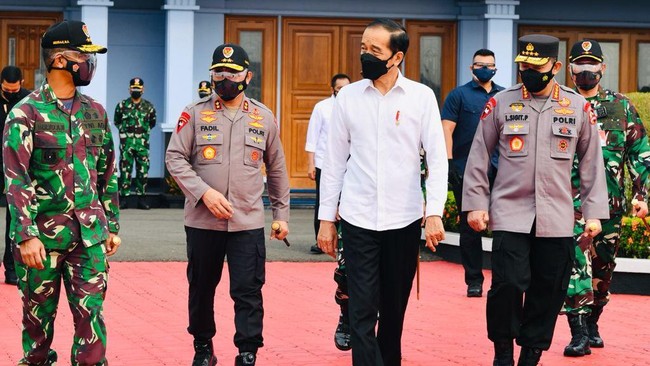 Jokowi didampingi Kapolri Jenderal Pol Listyo Sigit Prabowo, Kepala Sekretariat Presiden Heru Budi Hartono, Sekretaris Militer Presiden Marsda TNI M. Tonny Harjono, Komandan Paspampres Mayjen TNI Tri Budi Utomo, serta Deputi Bidang Protokol, Pers, dan Media Sekretariat Presiden Bey Machmudin.