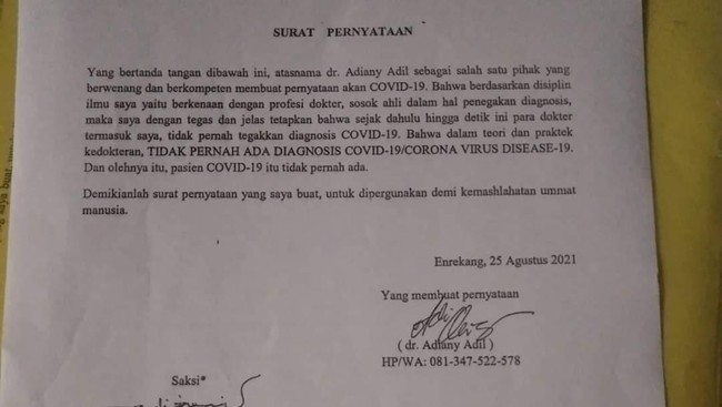 Sebelumnya, dokter Adiany akhirnya bersuara dan menyebut COVID-19 tidak dalam istilah medis. Dia mengatakan penolakannya soal adanya COVID-19 disebut telah dilakukannya sejak 2 tahun lalu. Namun baru tahun ini dia membuatnya dalam bentuk pernyataan.