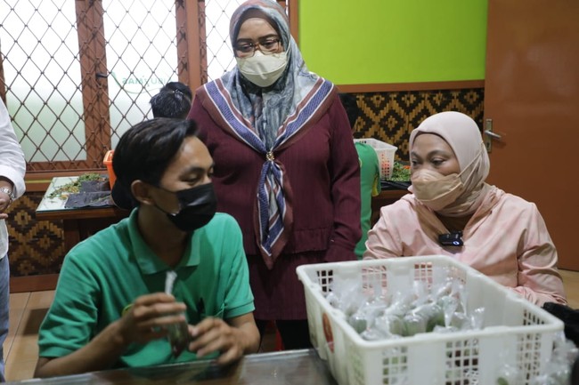 Di sela kunjungan kerjanya di Bandung, Jawa Barat, Menteri Ketenagakerjaan, Ida Fauziyah menyambangi para pekerja Warung Nasi Ibu Imas yang menjadi penerima Bantuan Subsidi Gaji/Upah (BSU) tahun 2021.