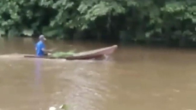 Rusa tersebut tampak mencoba menyelamatkan diri dengan berenang ke tengah sungai. Namun, ada warga lain yang datang menggunakan perahu dan diduga memukul rusa dengan tombak.