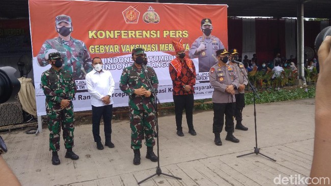 "Saya bersama Kapolri, Gubernur dan Wali Kota meninjau secara langsung kegiatan vaksinasi yang dilaksanakan di pasar induk, tepat sekali vaksinasi dilaksanakan di sini karena kita bisa langsung bertemu dengan pelaku usaha di pasar induk ini untuk diajak bersama-sama melaksanakan vaksin," kata Panglima TNI Hadi Tjahjanto.