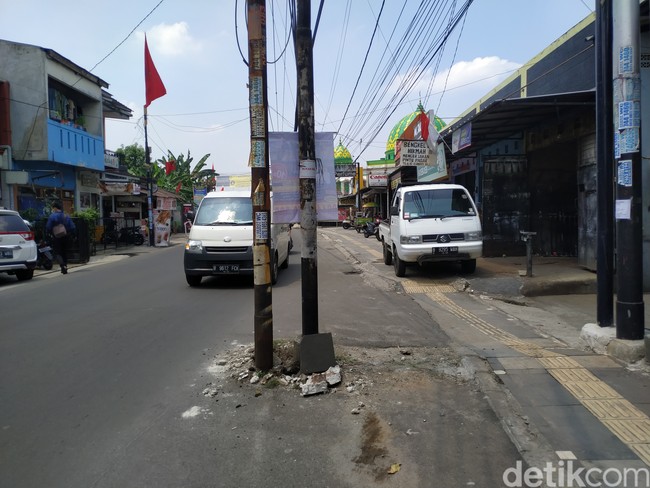 Tiang-tiang utilitas yang memakan badan jalan di Jl WR Supratman, Ciputat Timur, Tangerang Selatan, masih berdiri tegak. Padahal batas waktu pemindahan tiang ini sudah lewat, yaitu pada Senin (20/9).