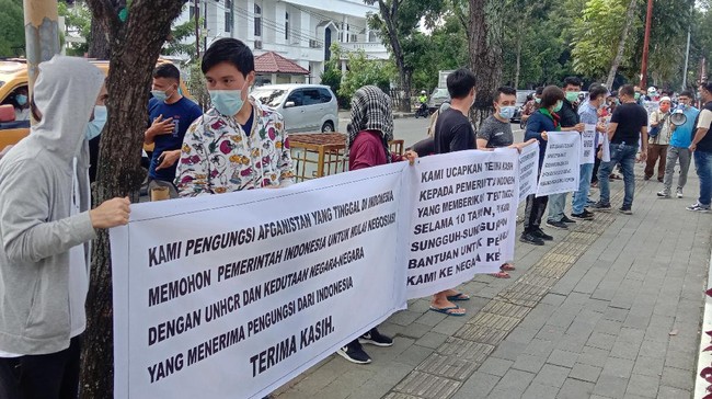 Sejumlah pengungsi asal Afganistan berdemo di depan kantor Gubernur Sumatera Utara (Gubsu). Mereka meminta dipindah ke negara lain.