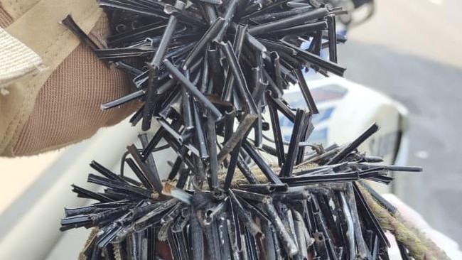 "Ini paku rangka payung. Paku ini ada rongganya. Jika paku kena ban, ban segera kehilangan angin dan tekanannya. Sehingga pengendara harus ganti ban. Jika dipaksakan, bannya rusak," jelas Alex.