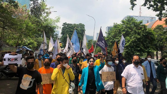 Massa aksi Aliansi Badan Eksekutif Mahasiswa Seluruh Indonesia (BEM SI) telah tiba di depan Gedung Merah Putih KPK, Jakarta Selatan. Mereka akan menyuarakan pendapatnya terkait polemik pemberhentian 56 pegawai KPK yang tak lolos tes wawasan kebangsaan (TWK).