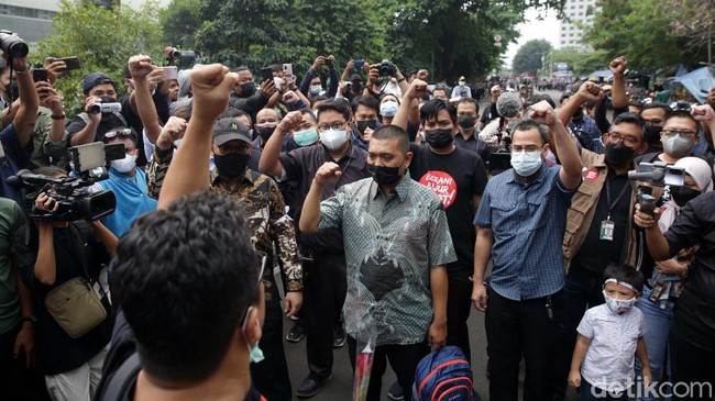 Saat di jalan, para pegawai disambut oleh eks pimpinan KPK, yakni Saut Situmorang dan Bambang Widjojanto (BW). Mereka berpelukan seraya mengucapkan selamat tinggal.