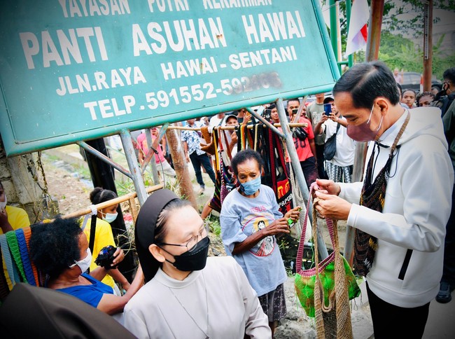 "Tas apa ini?" tanya Jokowi kepada Paulina Adi, salah seorang mama penjual noken di pinggir Jalan Raya Hawai Sentani, Jayapura.