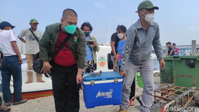 Rahmawati menyebut sampel tersebut akan diuji laboratorium untuk mengetahui kebenaran apakah ada kandungan paracetamol di air Laut Jakarta. Sampel tersebut terlihat disimpan dalam cool box berwarna biru.