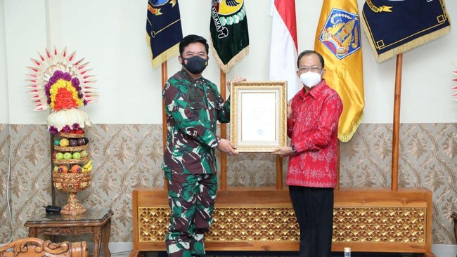 Panglima TNI Marsekal TNI Hadi Tjahjanto memberi piagam penghargaan kepada Gubernur Bali I Wayan Koster dan Forkopimda Bali. Dia mengapresiasi keberhasilan menurunkan kasus COVID-19.