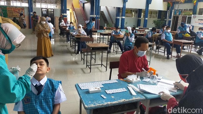 Siswa-siswi yang akan belajar sebelumnya melakukan tes antigen terlebih dahulu untuk menghindari adanya klaster sekolah.
