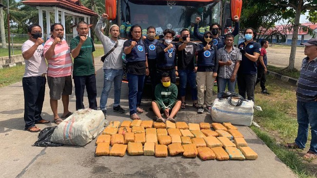 "45 kg ganja ini diamankan dari seorang kurir bernama Andika Noor Pratama, saat membawanya menggunakan sebuah bus antar kota antar provinsi. Penangkapan ini dilakukan setelah satu bulan memantau pergerakan pelaku," kata Kabid Berantas BNNP Jambi, Kombes Guntur Aryo Tejo kepada wartawan, Senin (4/10/2021).