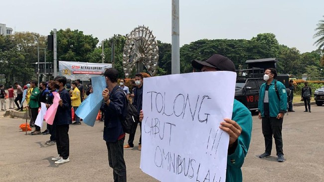 Badan Eksekutif Mahasiswa Seluruh Indonesia (BEM SI) menggelar aksi unjuk rasa terkait persidangan uji materiil UU Cipta Kerja. Aksi tersebut juga bertepatan dengan satu tahun pengesahan omnibus law Undang-Undang Cipta Kerja.