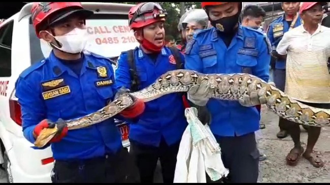 Ular piton tersebut diamankan petugas damkar. Pihak damkar berencana melepasliarkan ular itu ke habitat aslinya.