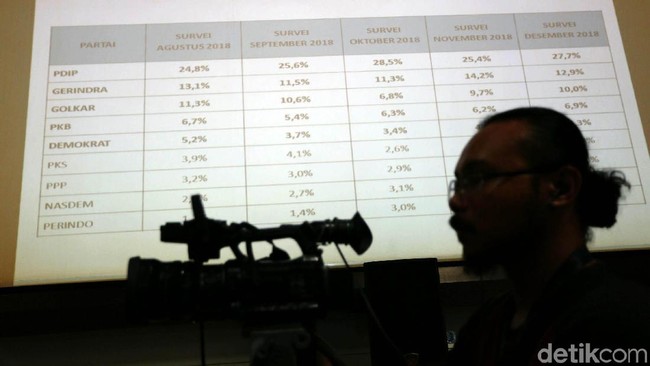 "Jika pemilu diadakan pada waktu survei PDIP mendapat dukungan paling besar 22,1%, disusul oleh Golkar 11,3% kemudian PKB 10%," kata Deni.