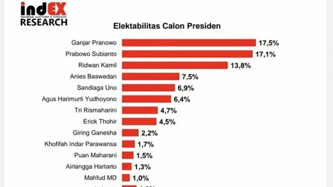 Indonesia Elections and Strategic (indEX) Research meluncurkan hasil survei yang menunjukkan Ganjar Pranowo, Prabowo Subianto, dan Ridwan Kamil menjadi 3 besar tokoh yang memiliki elektabilitas tinggi untuk maju sebagai calon Presiden 2024.