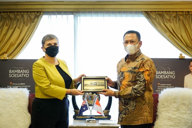 Ketua MPR RI Bambang Soesatyo menerima kunjungan Duta Besar Australia untuk RI, H.E. Ms. Penny Williams di Gedung Parlemen Jakarta. Dalam kesempatan itu, Bamsoet menyinggung soal kerja sama Australia-UK-US (AUKUS) hingga jalinan kerja sama antara RI dan Australia.