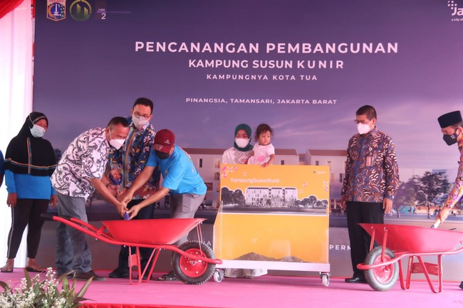 Gubernur DKI Jakarta Anies Baswedan meresmikan pencanangan pembangunan Kampung Susun Kunir di Tamansari, Jakarta Barat. Kampung susun diperuntukkan bagi 33 keluarga korban gusuran Kampung Kunir pada 2015 atau saat Gubernur DKI dijabat Basuki Tjahaja Purnama (Ahok).