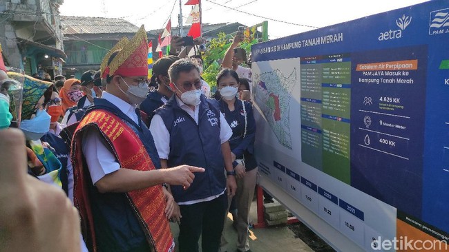 "Hampir semua mencari tempat yang dekat air. Bagaimana bisa hidup di sebuah tempat yang tidak ada fasilitas air? Karena itulah kemudian kita pastikan dan alhamdulillah sekarang warga di Tanah Merah ini sudah bisa mendapatkan air bersih lewat pipa yang disalurkan ke rumah-rumah yang ada di Tanah Merah ini," sambungnya.