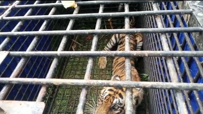 Harimau dewasa ini ditemukan masuk perangkap kemarin. Harimau berukuran panjang 180 cm itu terperangkap dalam kondisi kaki terluka.