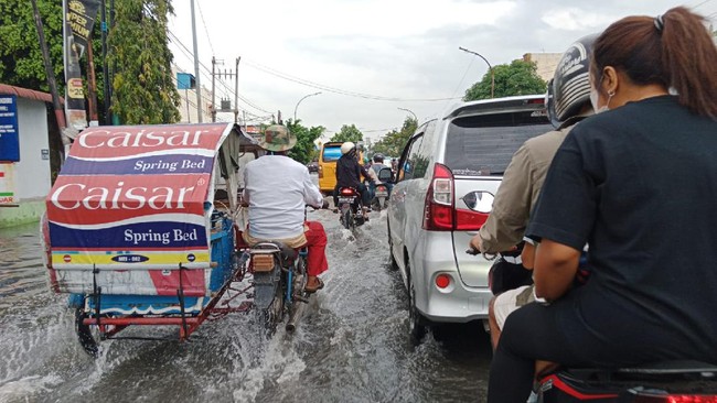 Terlihat ada pengendara yang mendorong sepeda motornya karena mati akibat bagian mesinnya terendam banjir. Di lokasi banjir juga terlihat anak-anak yang sedang bermain air.