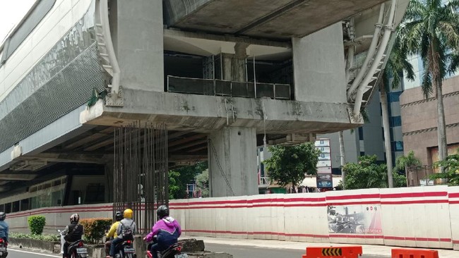 Seorang pekerja terjatuh dari proyek pembangunan LRT di depan Plaza Festival, Setiabudi, Jakarta Selatan. Polisi memastikan korban dalam kondisi masih hidup.