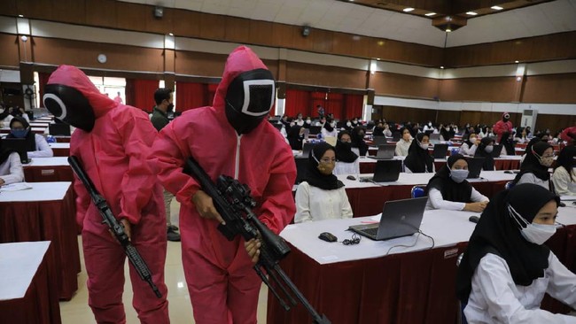 Pada SKD CPNS Kemenkumham kemarin (Rabu, 20/10), panitia berdandan ala Pink Soldier dalam film seri Squid Game. Suasana ala Squid Game memang sudah terasa sejak para peserta sesi II hari ke-12 memasuki venue di Universitas 17 Agustus 1945 Surabaya.