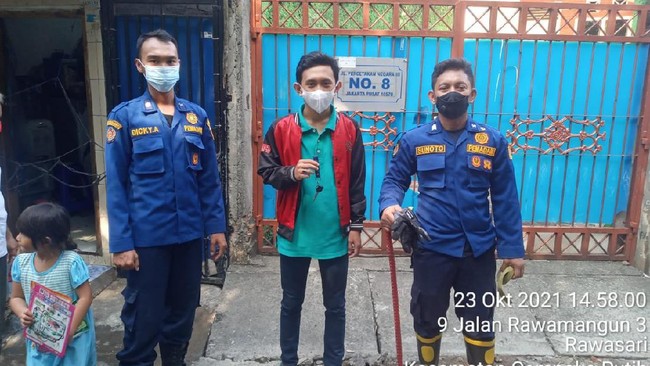 Peristiwa itu terjadi hari ini sekitar pukul 14.00 WIB. Dalam foto yang diunggah oleh Damkar DKI, terlihat beberapa orang petugas damkar mendatangi lokasi kejadian.