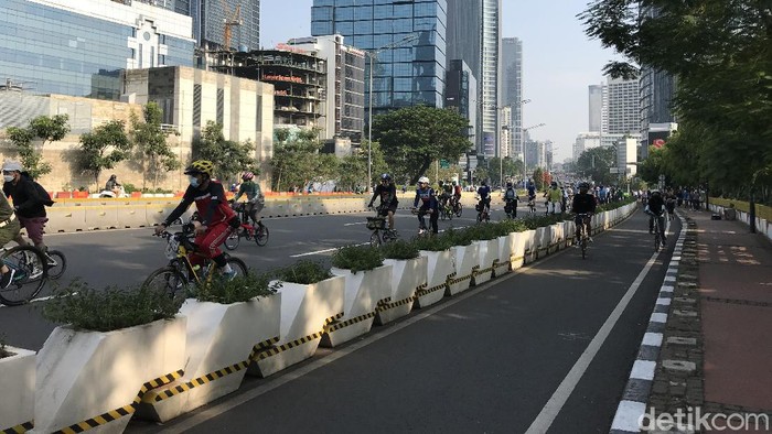 Pantauan detikcom di Jalan Sudirman-Thamrin, Jakarta, Minggu (24/10/2021), pukul 07.30 WIB, tampak pesepeda melintas di jalur umum kendaraan. Mereka berdampingan dengan kendaraan mobil dan motor. Tak terlihat petugas Satpol PP dan Dinas Perhubungan (Dishub) yang melakukan penindakan.