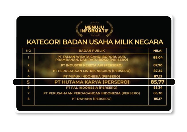 "Proses monev yang kami lalui mulai dari pengisian kuesioner, penyiapan video, hingga presentasi oleh masing-masing Badan Publik. Di tahun 2021 Hutama Karya mampu memperoleh hasil yang baik, meningkat 25,19 poin sehingga naik satu peringkat dibanding tahun 2020 yaitu 60,58 dengan kategori Cukup Informatif," jelas Tjahjo dalam keterangan tertulis, Selasa (26/10/2021).