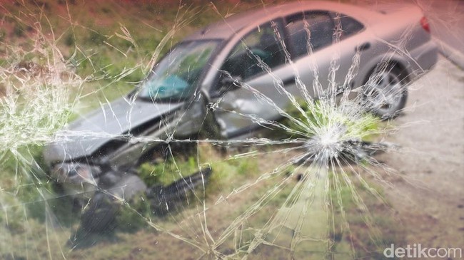 Mobil berwarna abu-abu tersebut terlihat mengalami kerusakan cukup berat. Kaca mobil pecah hingga pintu mobil pun terlihat rusak.