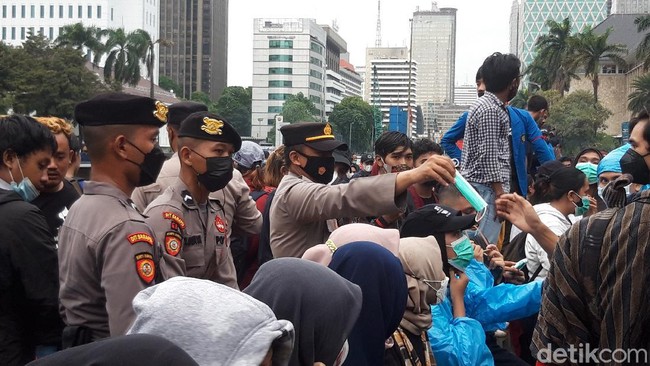 Sejumlah petugas kepolisian membagikan masker gratis kepada massa yang menggelar aksi di sekitar Patung Kuda, Jakarta Pusat. Melalui alat pengeras suara, polisi mengingatkan bahwa Indonesia masih dalam kondisi pandemi COVID-19.