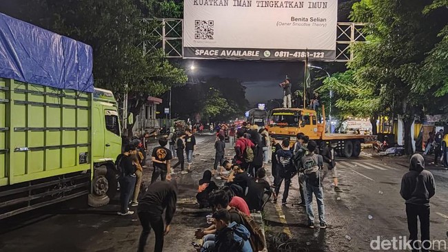 Massa mahasiswa yang berunjuk rasa sejak sore tadi masih terus bertahan di Jalan Sultan Alauddin, Makassar, hingga malam. Massa kini menyandera sejumlah truk lalu memblokade dua ruas jalan.