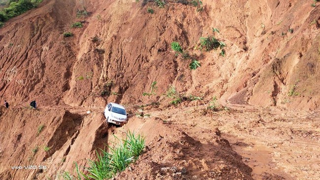 Tanah berlumpur campur dengan batang pohon menutup permukaan jalan sepanjang puluhan meter. Akibatnya, sebuah mobil yang sedang melintas nyaris masuk jurang lantaran terseret material longsor. Beruntung, peristiwa tersebut tidak menyebabkan korban.