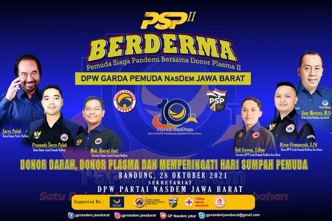 "Kami berupaya tetap konsisten untuk menjaga optimisme di tengah pandemi COVID-19 sekaligus memperingati Hari Sumpah Pemuda dengan menggelar donor darah dan donor plasma bertajuk PSP BERDERMA II bekerja sama dengan Palang Merah Indonesia Kab Bandung Barat," kata Ketua DPW Garda Pemuda NasDem Jawa Barat Rian Firmansyah dalam keterangan tertulis, Sabtu (30/10/2021).