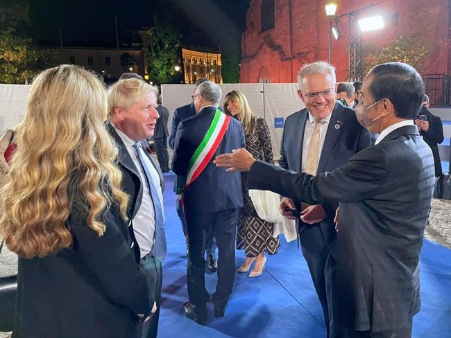 Jokowi tiba di tempat yang dibangun antara tahun 298 dan 306 Masehi tersebut pada 20.11 waktu setempat. Jokowi tampak berbincang bersama sejumlah pemimpin seperti Perdana Menteri Inggris Boris Johnson, Perdana Menteri Australia Scott Morrison, hingga Presiden Korea Selatan Moon Jae-in. Dari foto yang dibagikan, perbincangan para pemimpin negara itu tampak hangat dan penuh senyum.