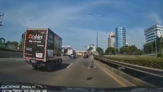 Dalam video itu tampak seorang perempuan dengan santuy atau santai menyeberang di jalan tol. Aksi itu disebutkan di Tol Jakarta Outer Ring Road (JORR) Fatmawati, Jaksel.