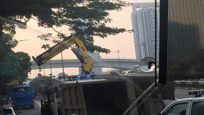 Petugas masih melakukan evakuasi truk muatan pasir yang terguling di Jl Gatot Subroto, Jakarta Selatan, tepatnya di depan Balai Kartini. Selama proses evakuasi, jalur lambat di Jl Gatot Subroto ditutup dan diarahkan ke flyover.