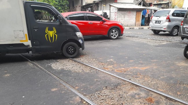 Sementara itu, dari arah sebaliknya, yang dibelah oleh kali, perlintasan sebidang kereta tampak bagus. Kendaraan dengan leluasa maju tanpa perlu menghindari lubang.